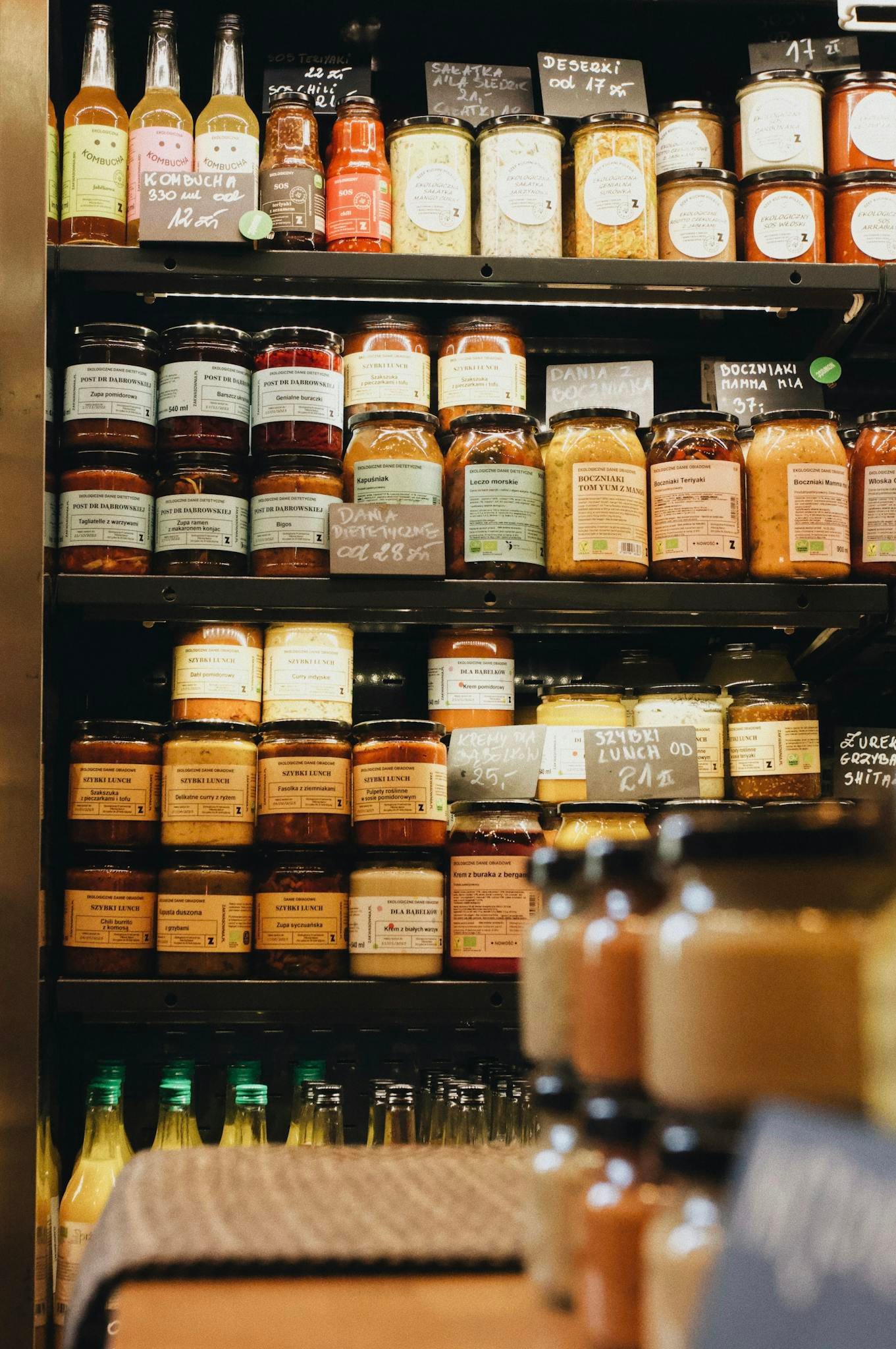 Assorted jars and bottles neatly arranged on market shelves in a Polish store.